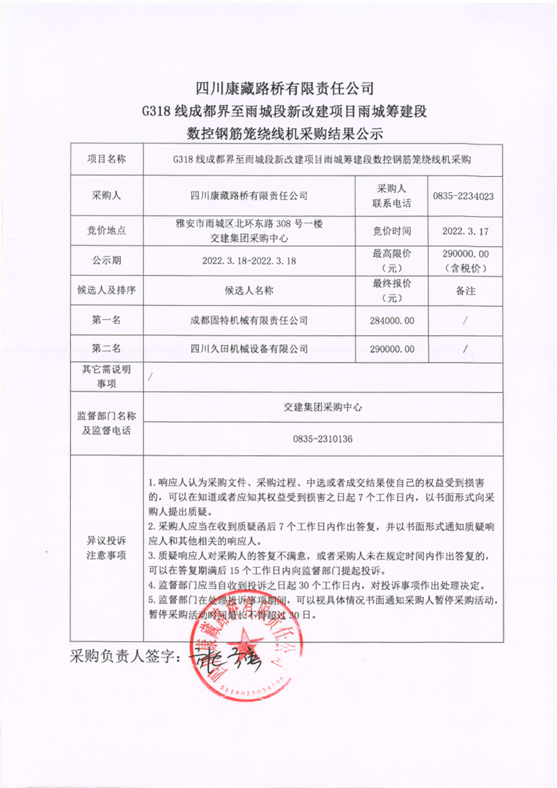 四川康藏路橋有限責任公司G318線成都界至雨城段新改建項目雨城籌建段數控鋼筋籠繞線機采購結果公示