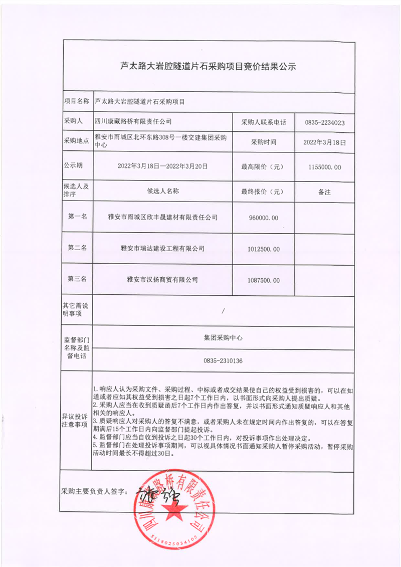 四川康藏路橋有限責任公司蘆太路大巖腔隧道片石采購項目競價結(jié)果公示