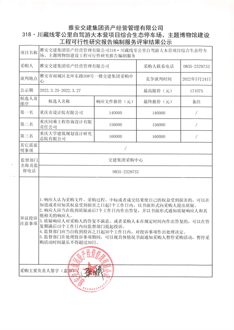 雅安交建集團資產(chǎn)經(jīng)營管理有限公司318.川藏線零公里自駕游大本營項目綜合生態(tài)停車場、主題博物館建設工程可行性研究報告編制服務評審結(jié)果公示