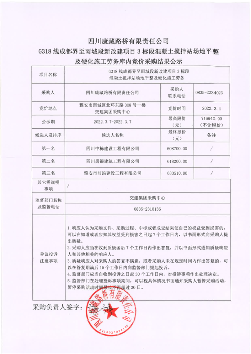 四川康藏路橋有限責任公司G318線成都界至雨城段新改建項目3標段混凝土攪拌站場地平整及硬化施工勞務(wù)庫內(nèi)競價采購結(jié)果公示
