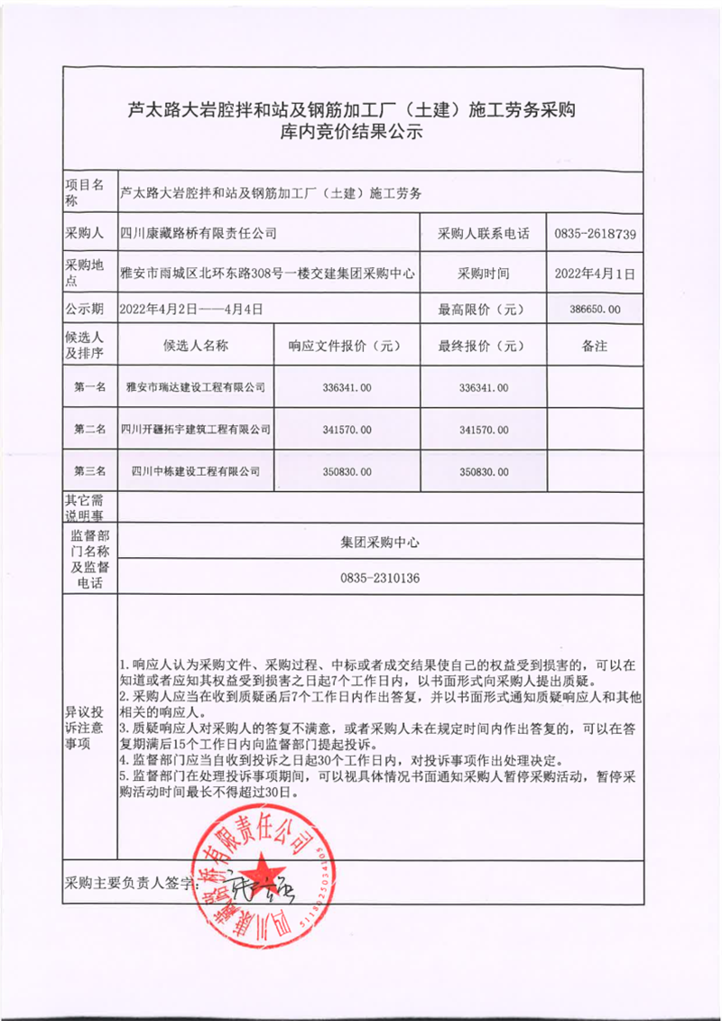 四川康藏路橋有限責任公司蘆太路大巖腔拌和站及鋼筋加工廠(土建)施工勞務采購庫內(nèi)競價結果公示
