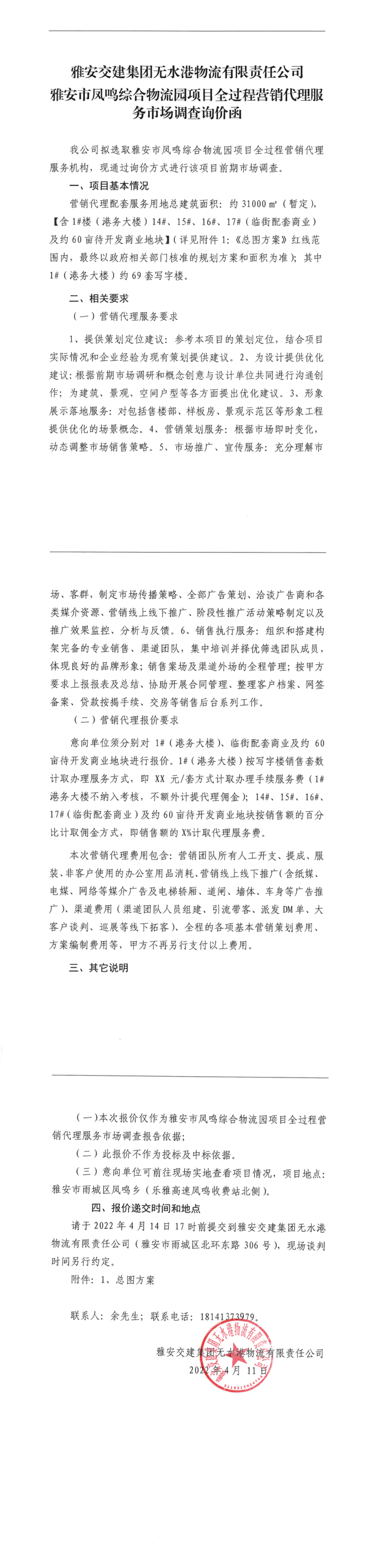 雅安交建集團(tuán)無水港物流有限責(zé)任公司雅安市鳳鳴綜合物流園項(xiàng)目全過程營銷代理服務(wù)市場調(diào)查詢價(jià)函