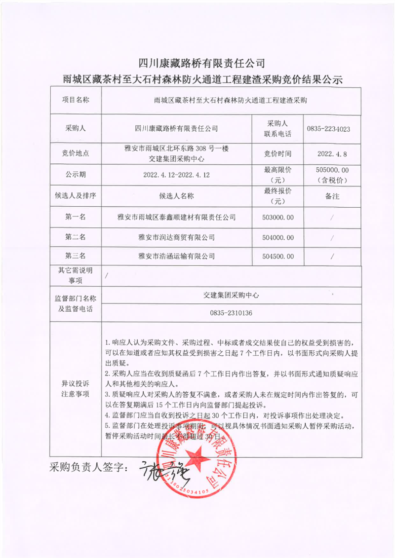 四川康藏路橋有限責任公司雨城區(qū)藏茶村至大石村森林防火通道工程建渣采購競價結(jié)果公示