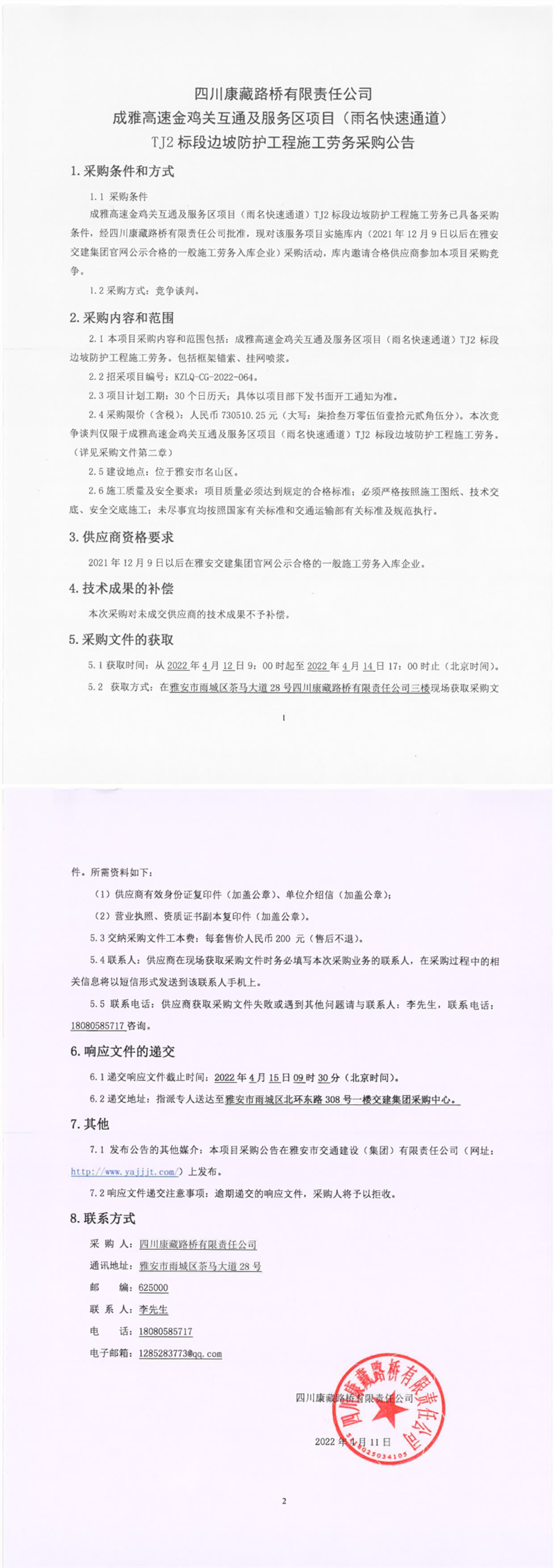 四川康藏路橋有限責任公司成雅高速金雞關(guān)互通及服務(wù)區(qū)項目(雨名快速通道)TJ2標段邊坡防護工程施工勞務(wù)采購公告