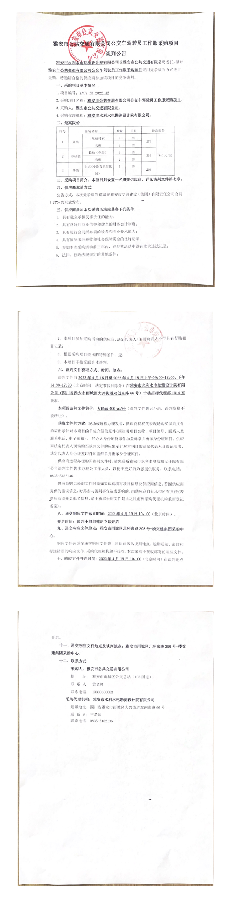 雅安市公共交通有限公司公交車駕駛員工作服采購(gòu)項(xiàng)目談判公告