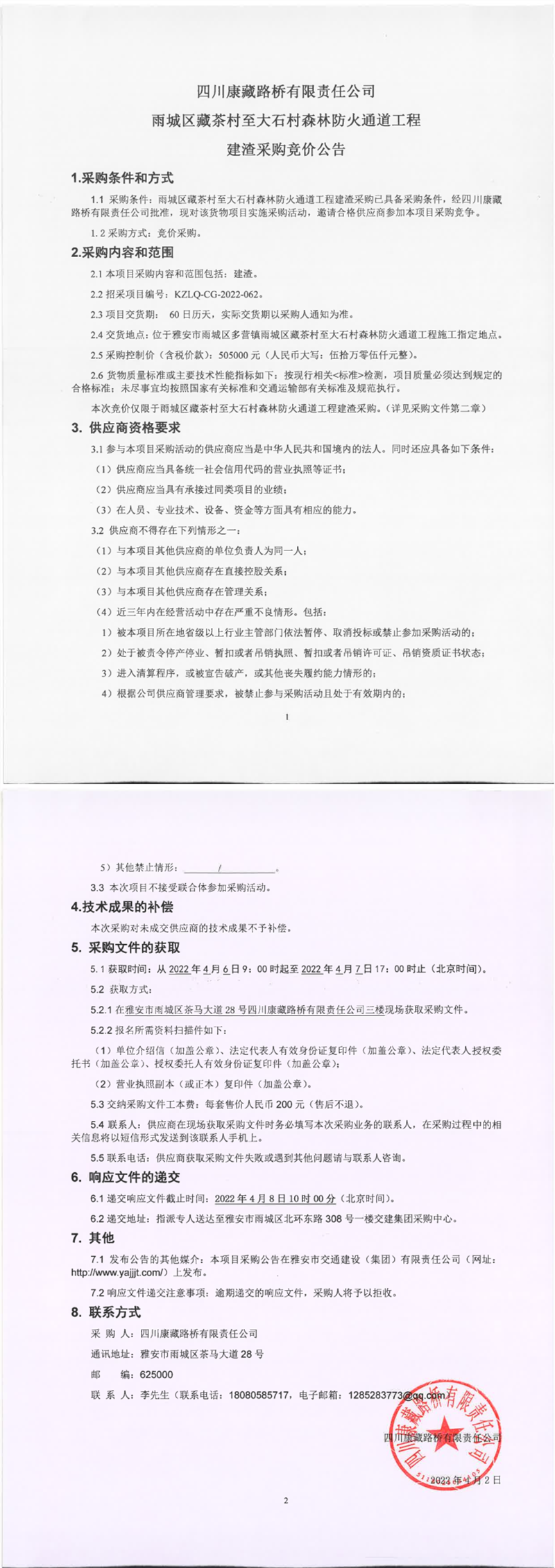 四川康藏路橋有限責(zé)任公司雨城區(qū)藏茶村至大石村森林防火通道工程建渣采購競價(jià)公告