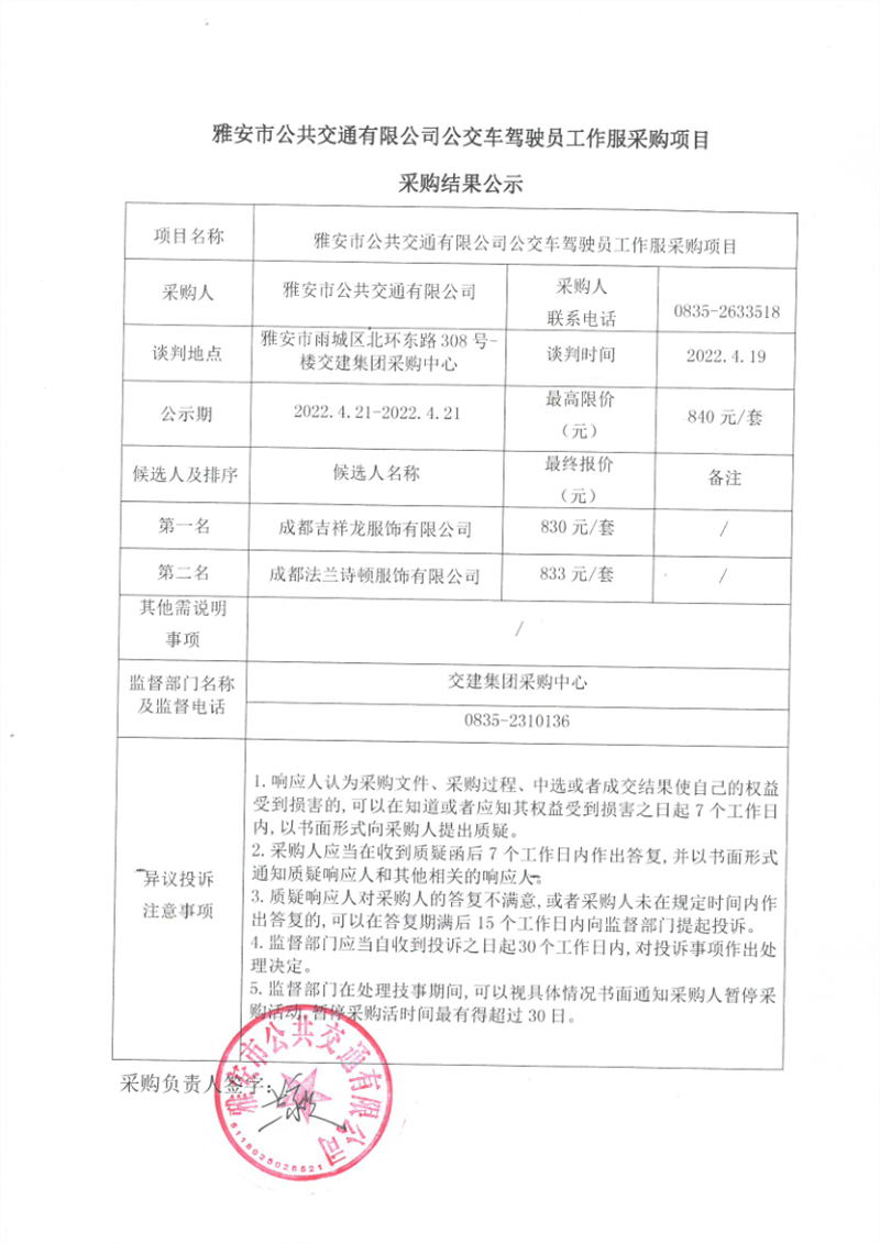 雅安市公共交通有限公司公交車駕駛員工作服采購項(xiàng)目采購結(jié)果公示