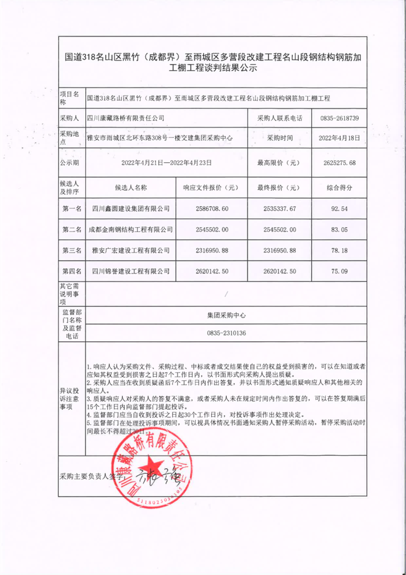 四川康藏路橋有限責任公司國道318名山區(qū)黑竹(成都界)至雨城區(qū)多營段改建工程名山段鋼結構鋼筋加工棚工程談判結果公示