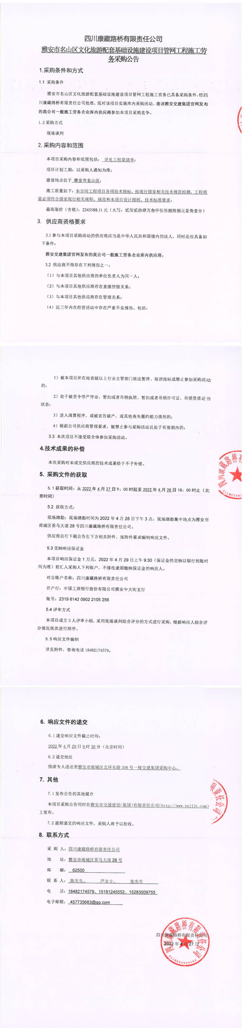 四川康藏路橋有限責任公司雅安市名山區(qū)文化旅游配套基礎設施建設項目管網(wǎng)工程施工勞務采購公告