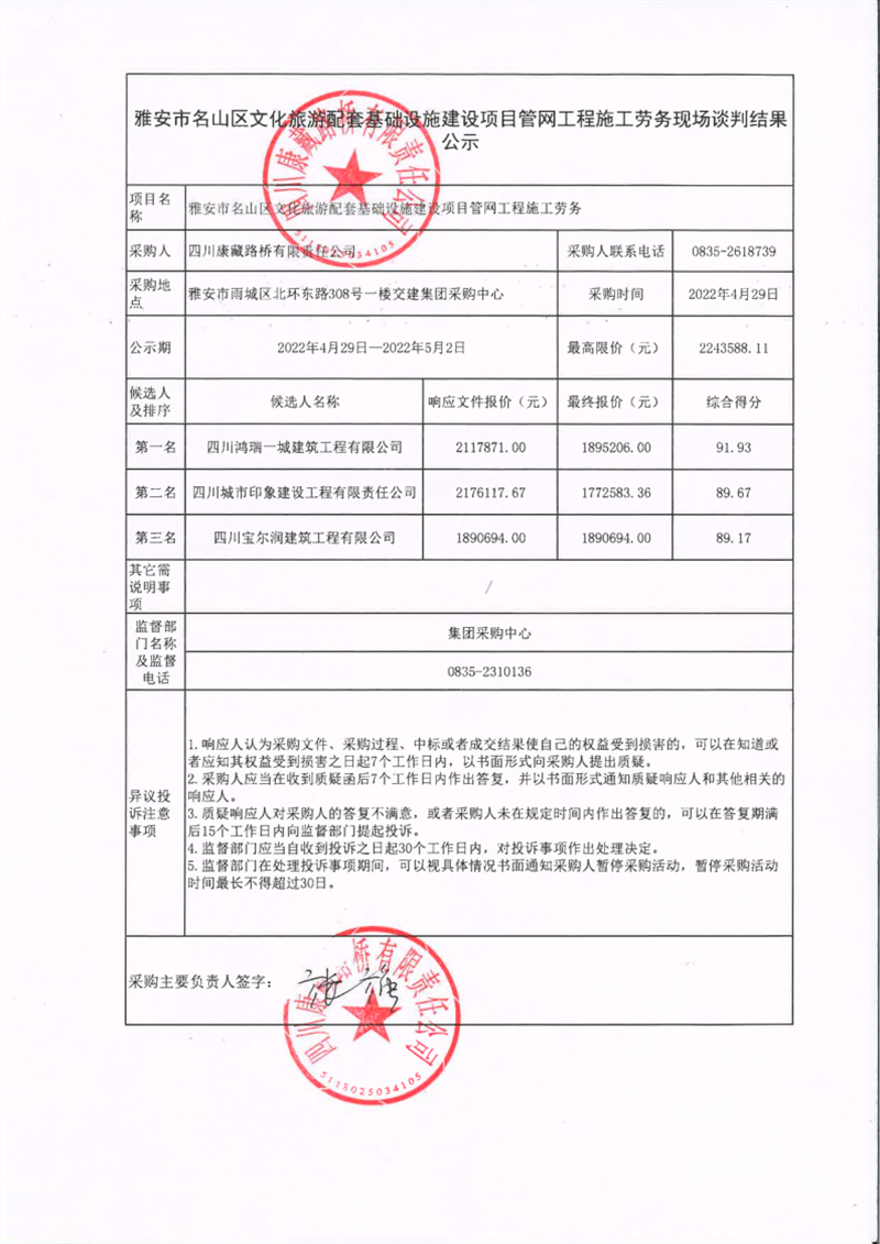 四川康藏路橋有限責任公司雅安市名山區(qū)文化旅游配套基礎設施建設項目管網(wǎng)工程施工勞務現(xiàn)場談判結果公示