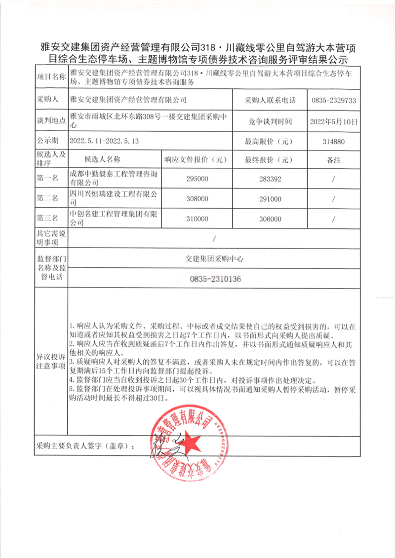 雅安交建集團(tuán)資產(chǎn)經(jīng)營(yíng)管理有限公司318·川藏線零公里自駕游大本營(yíng)項(xiàng)目綜合生態(tài)停車場(chǎng)、主題博物館專項(xiàng)債券技術(shù)咨詢服務(wù)評(píng)審結(jié)果公示
