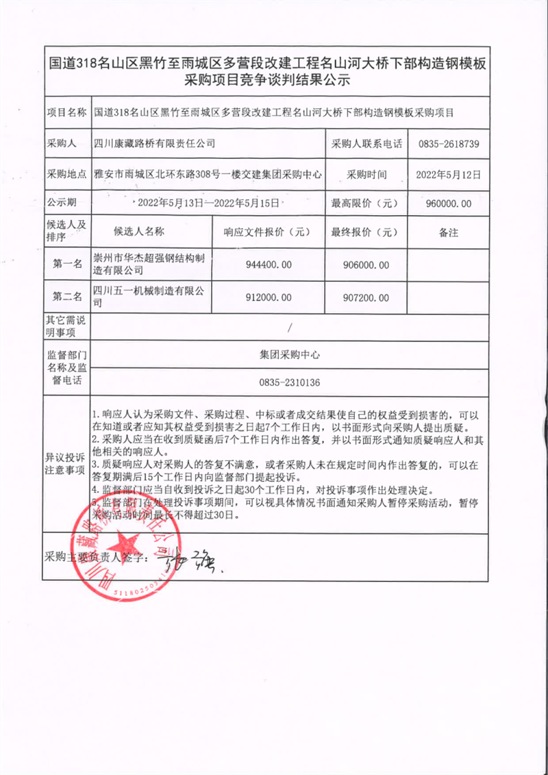 四川康藏路橋有限責任公司國道318名山區(qū)黑竹至雨城區(qū)多營段改建工程名山河大橋下部構(gòu)造鋼模板采購項目競爭談判結(jié)果公示