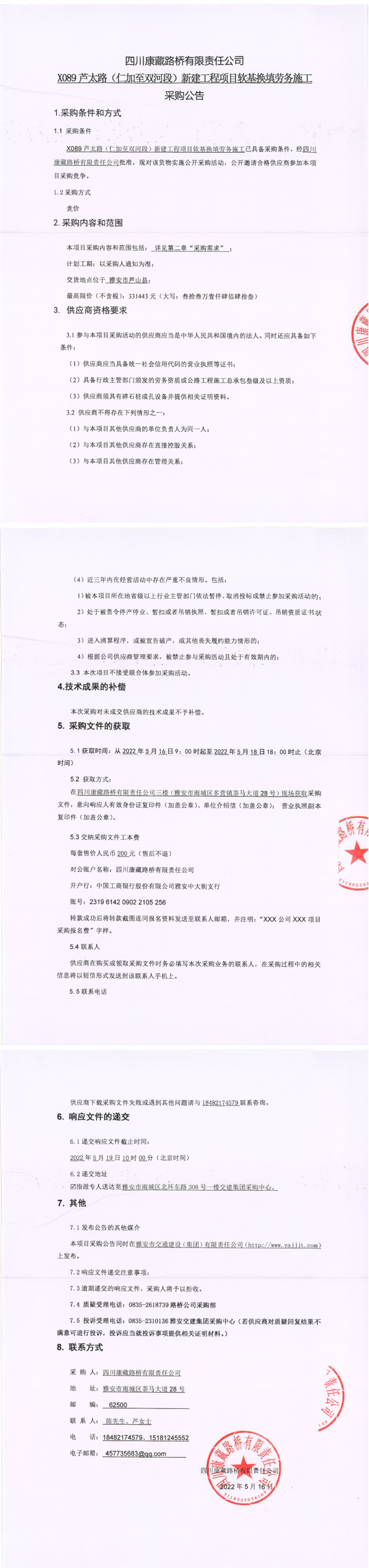 四川康藏路橋有限責任公司X089蘆太路(仁加至雙河段)新建工程項目軟基換填勞務(wù)施工采購公告