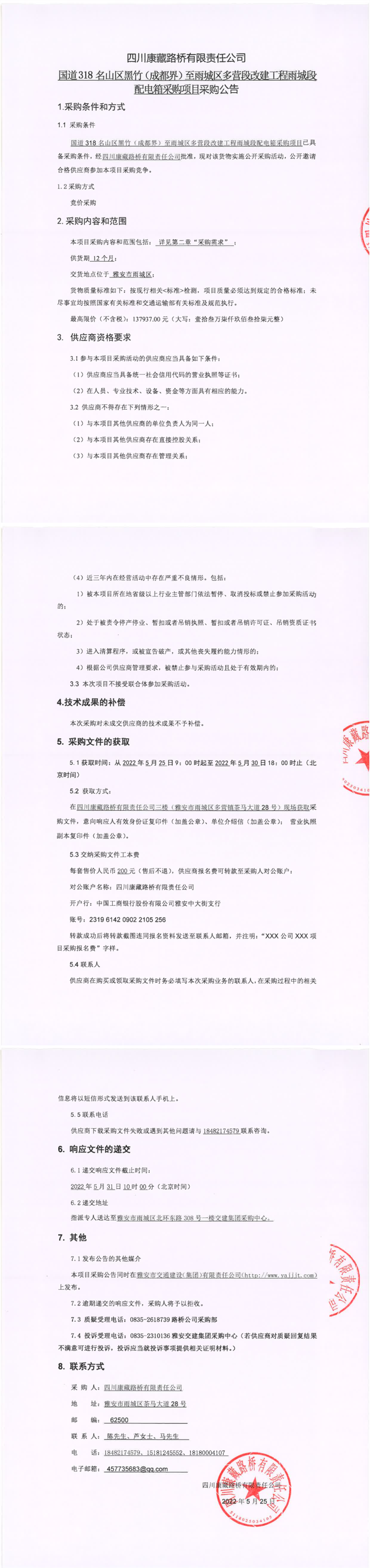四川康藏路橋有限責(zé)任公司國道318名山區(qū)黑竹(成都界)至雨城區(qū)多營段改建工程雨城段配電箱采購項(xiàng)目采購公告