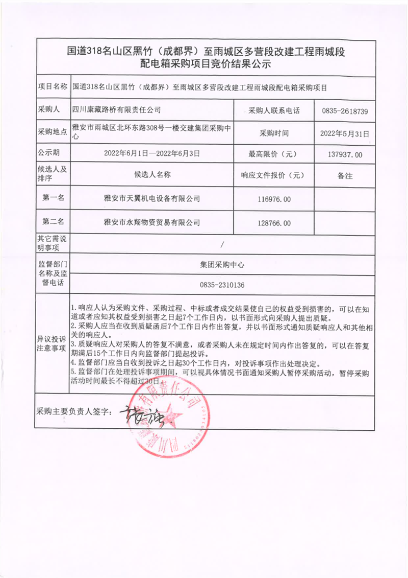 四川康藏路橋有限責任公司國道318名山區(qū)黑竹(成都界)至雨城區(qū)多營段改建工程雨城段配電箱采購項目競價結(jié)果公示