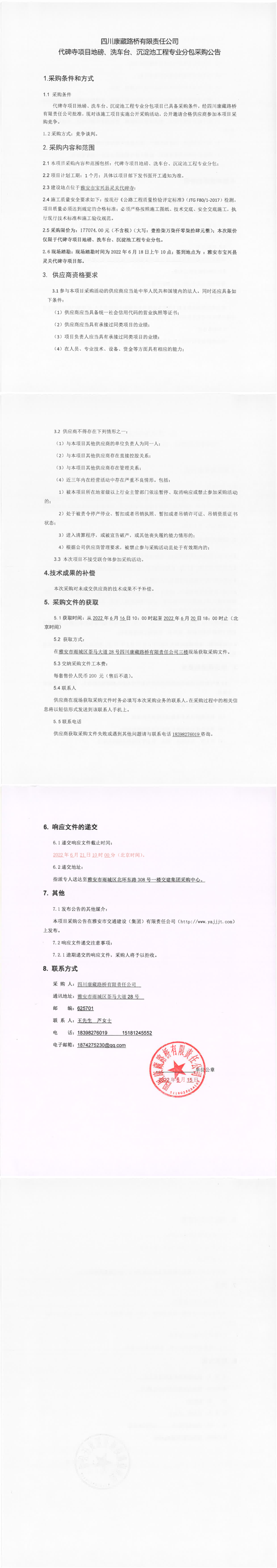 四川康藏路橋有限責(zé)任公司代碑寺項(xiàng)目地磅、洗車(chē)臺(tái)、沉淀池工程專業(yè)分包采購(gòu)公告