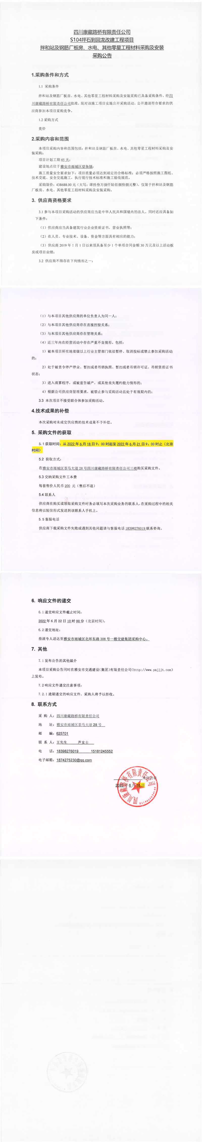 四川康藏路橋有限責(zé)任公司S104坪石到回龍改建工程項(xiàng)目拌和站及鋼筋廠板房、水電、其他零星工程材料采購(gòu)及安裝采購(gòu)公告