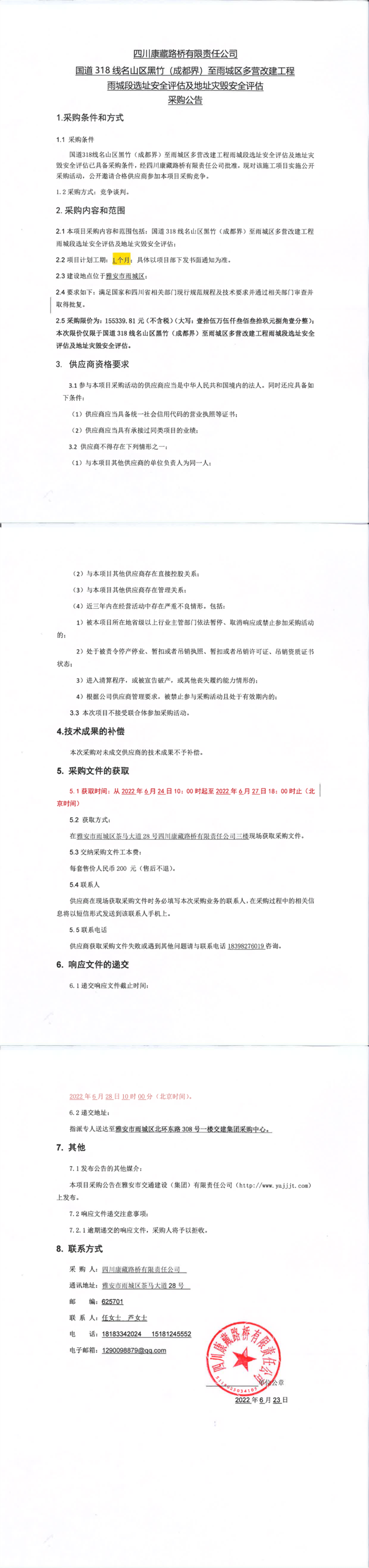 四川康藏路橋有限責任公司國道318名山區(qū)黑竹(成都界)至雨城區(qū)多營段改建工程雨城段選址安全評估及地址災毀安全評估采購公告
