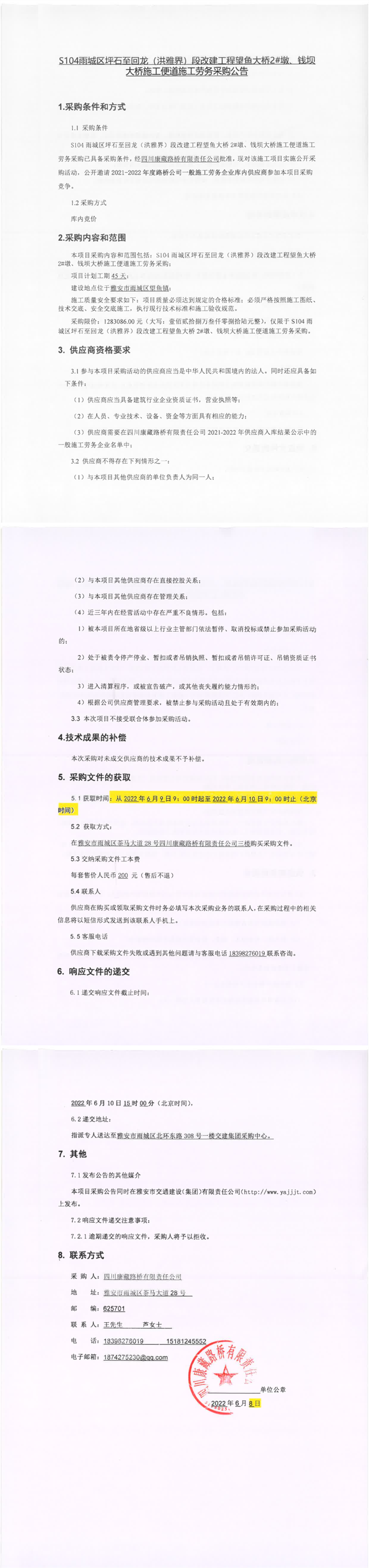 四川康藏路橋有限責(zé)任公司S104雨城區(qū)坪石至回龍(洪雅界)段改建工程望魚(yú)大橋2#墩、錢(qián)壩大橋施工便道施工勞務(wù)采購(gòu)公告