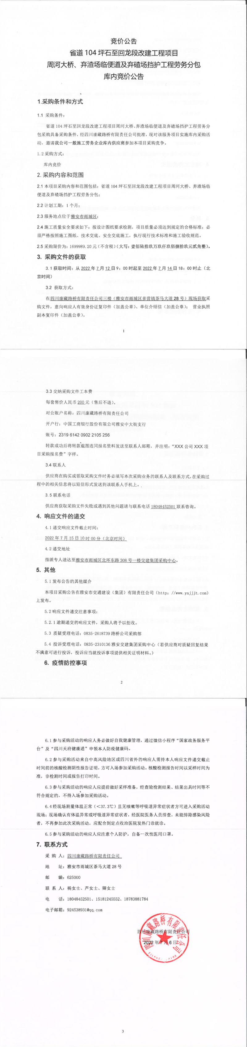 四川康藏路橋有限責(zé)任公司省道104坪石至回龍段改建工程項目周河大橋、棄渣場臨便道及棄碴場擋護(hù)工程勞務(wù)分包庫內(nèi)競價公告