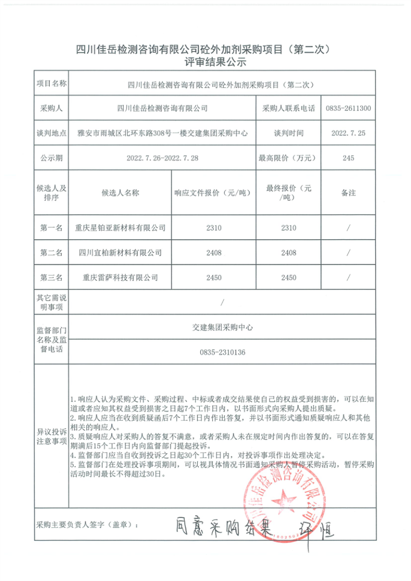 四川佳岳檢測(cè)咨詢有限公司砼外加劑采購(gòu)項(xiàng)目(第二次)評(píng)審結(jié)果公示