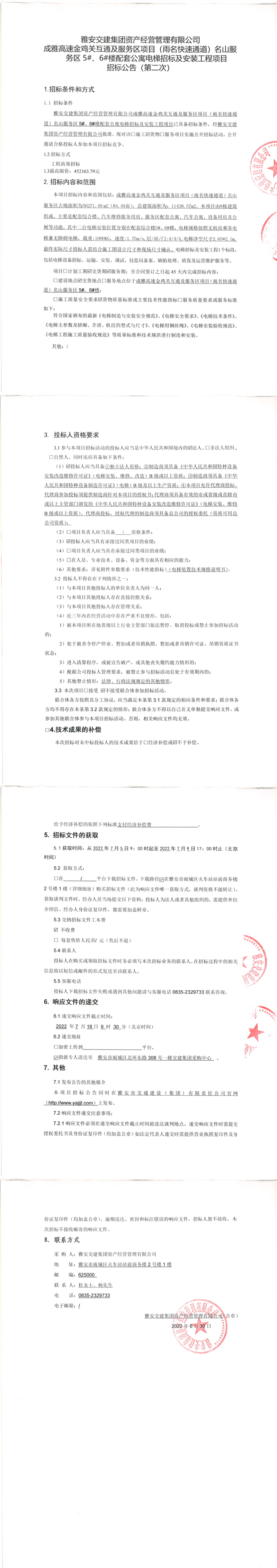 雅安交建集團(tuán)資產(chǎn)經(jīng)營管理有限公司成雅高速金雞關(guān)互通及服務(wù)區(qū)項(xiàng)目(雨名快速通道)名山服務(wù)區(qū)5#、6#樓配套公寓電梯招標(biāo)及安裝工程項(xiàng)目招標(biāo)公告(第二次)