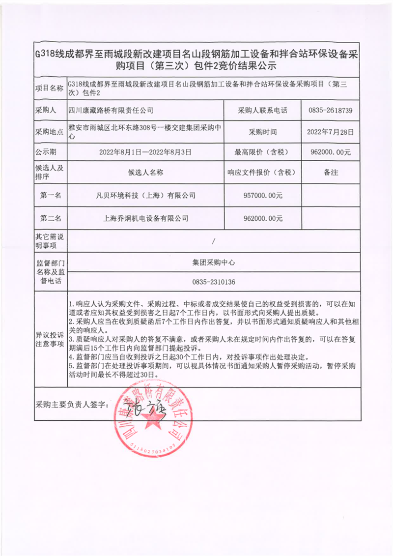 四川康藏路橋有限責(zé)任公司G318線成都界至雨城段新改建項(xiàng)目名山段鋼筋加工設(shè)備和拌合站環(huán)保設(shè)備采購(gòu)項(xiàng)目(第三次)包件2競(jìng)價(jià)結(jié)果公示