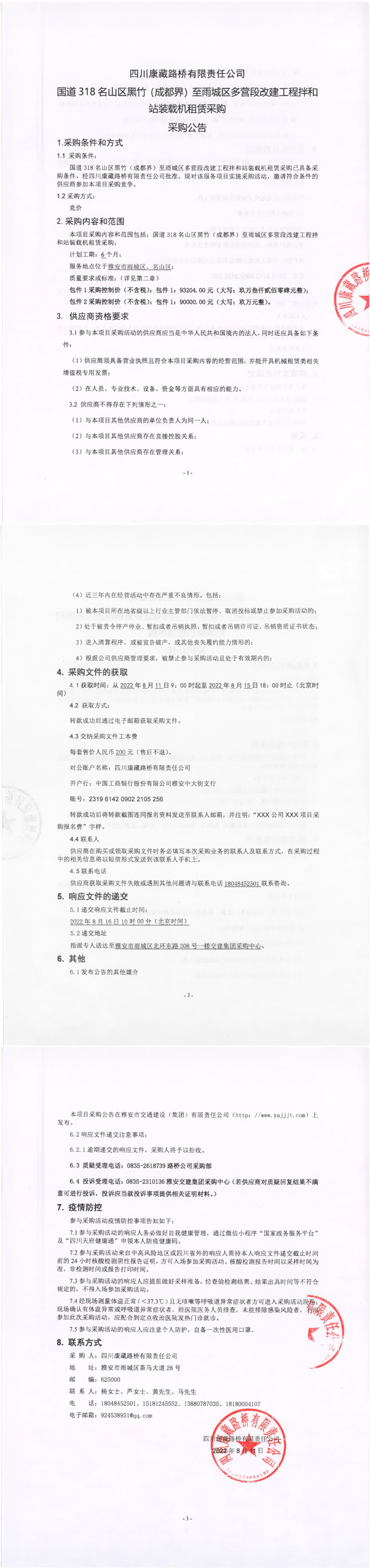 四川康藏路橋有限責(zé)任公司國(guó)道318名山區(qū)黑竹(成都界)至雨城區(qū)多營(yíng)段改建工程拌和站裝載機(jī)租賃采購(gòu)公告