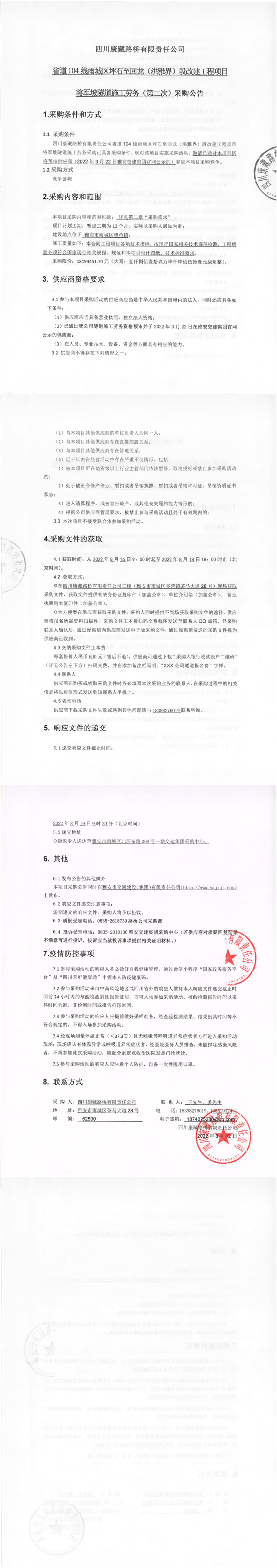 四川康藏路橋有限責(zé)任公司省道104線雨城區(qū)坪石至回龍(洪雅界)段改建工程項(xiàng)目