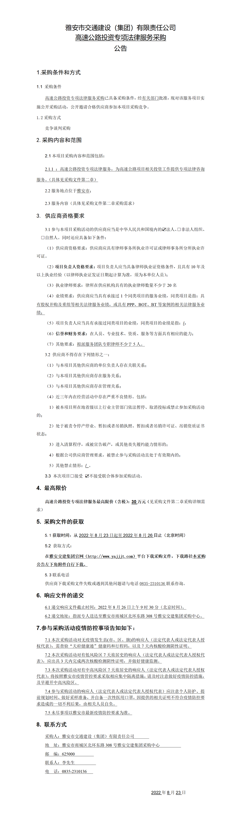 雅安市交通建設(shè)(集團(tuán))有限責(zé)任公司高速公路投資專項(xiàng)法律服務(wù)采購(gòu)公告