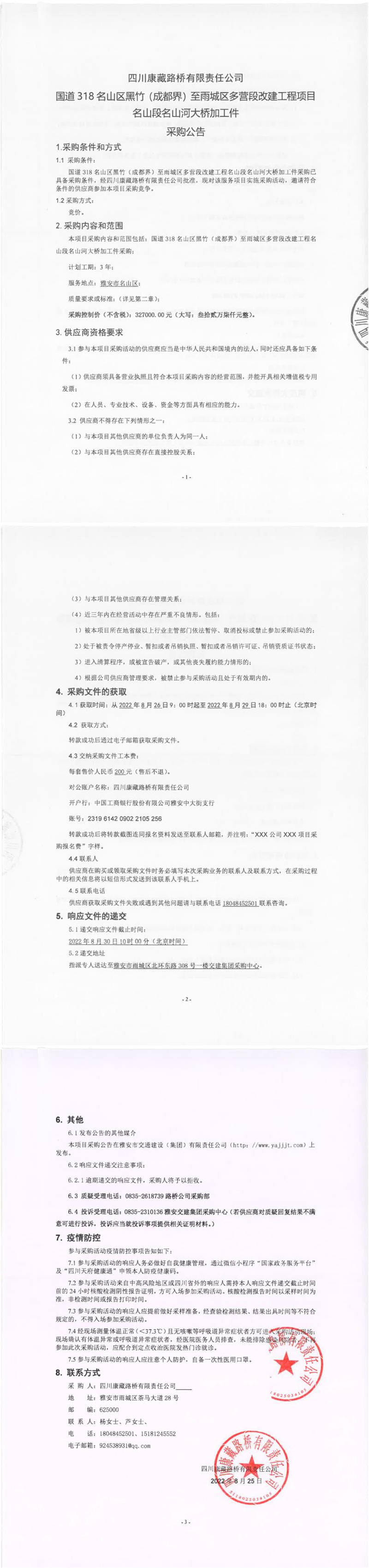 四川康藏路橋有限責(zé)任公司國(guó)道318名山區(qū)黑竹(成都界)至雨城區(qū)多營(yíng)段改建工程項(xiàng)目名山段名山河大橋加工件采購(gòu)公告