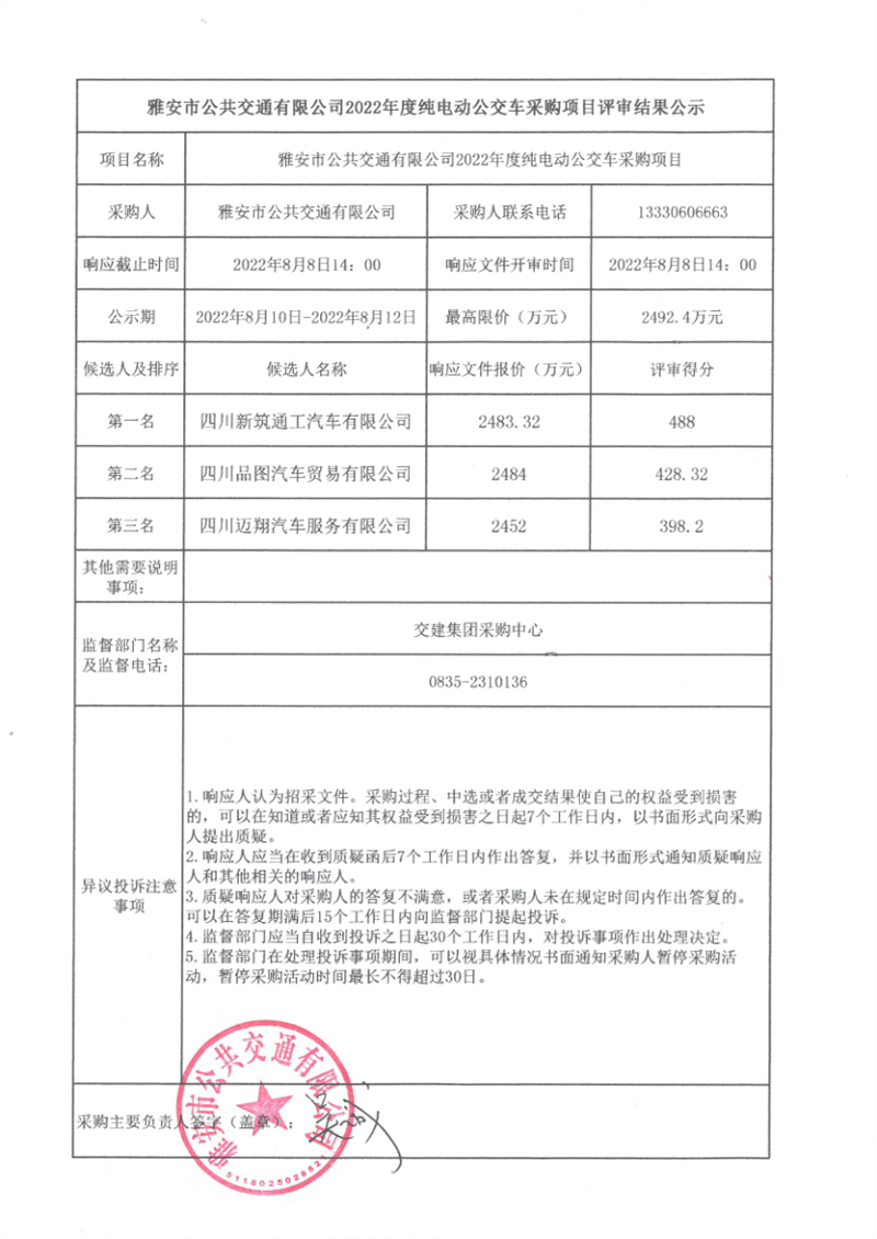 雅安市公共交通有限公司2022年度純電動(dòng)公交車采購項(xiàng)目評(píng)審結(jié)果公示