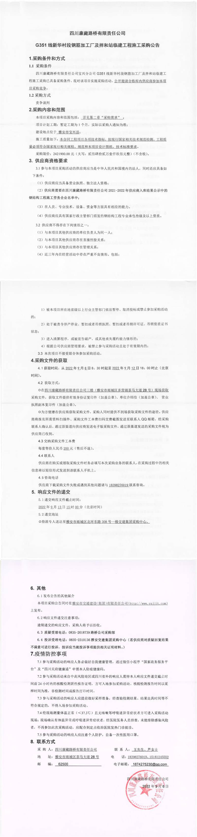 四川康藏路橋有限責(zé)任公司G351線新華村段鋼筋加工廠及拌和站臨建工程施工采購(gòu)公告