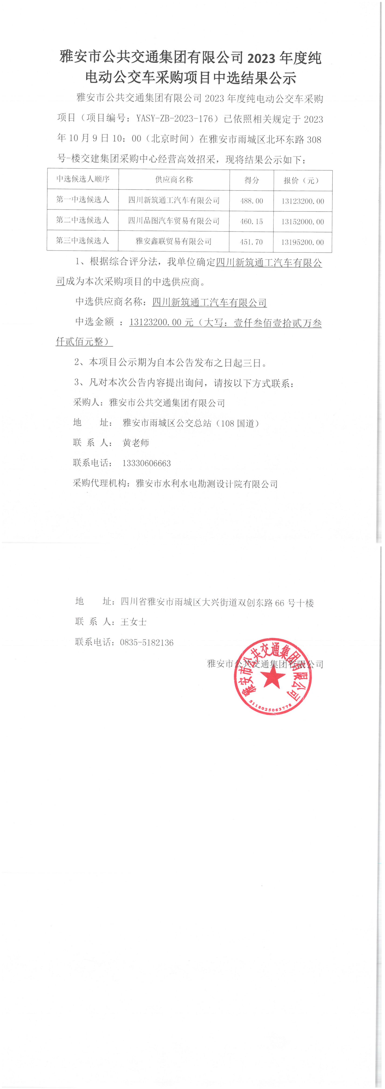 雅安市公共交通集團(tuán)有限公司2023年度純電動(dòng)公交車采購項(xiàng)目中選結(jié)果公示
