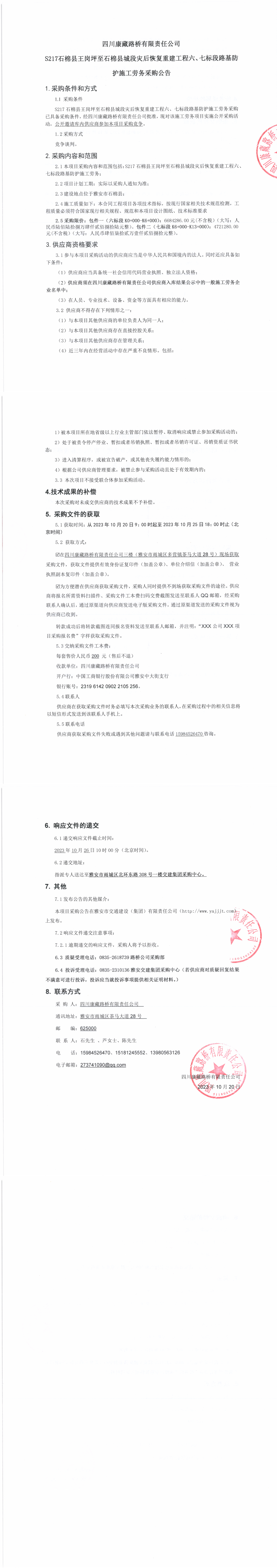 四川康藏路橋有限責(zé)任公司S217石棉縣王崗坪至石棉縣城段災(zāi)后恢復(fù)重建工程六、七標(biāo)段路基防護(hù)施工勞務(wù)采購公告