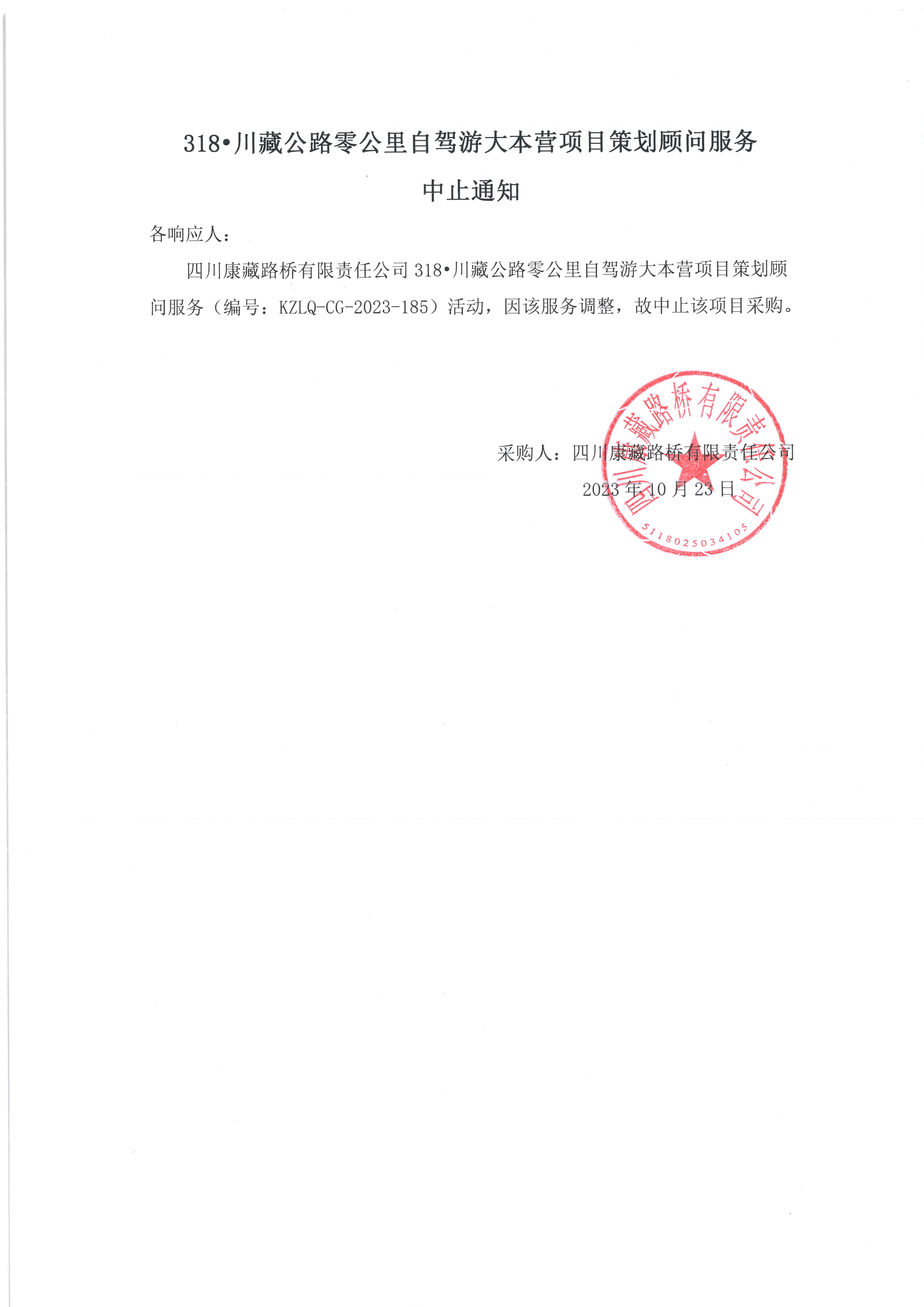 四川康藏路橋有限責(zé)任公司318•川藏公路零公里自駕游大本營(yíng)項(xiàng)目策劃顧問(wèn)服務(wù)中止通知