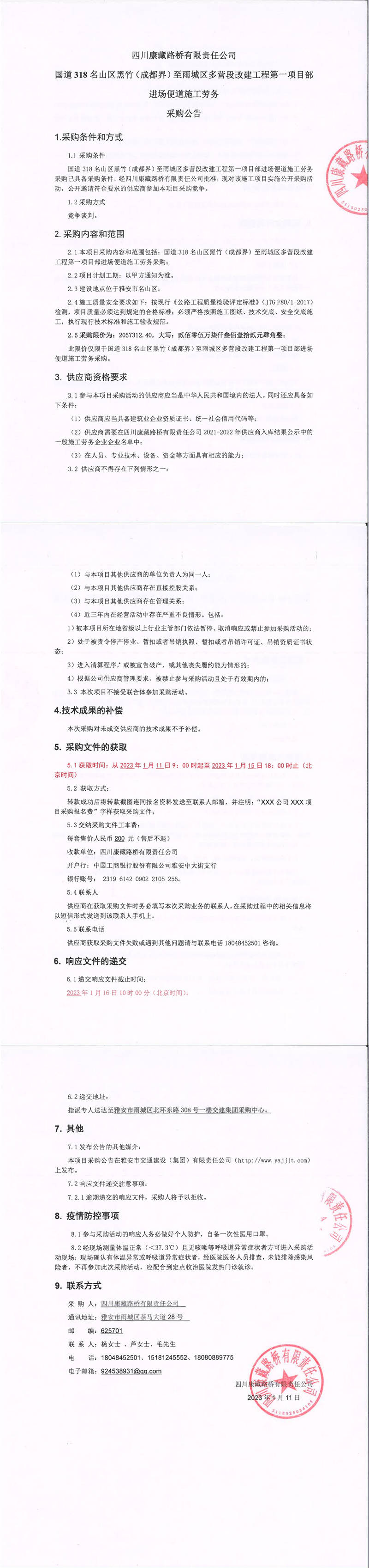 四川康藏路橋有限責任公司國道318名山區(qū)黑竹(成都界)至雨城區(qū)多營段改建工程第一項目部進場便道施工勞務采購公告