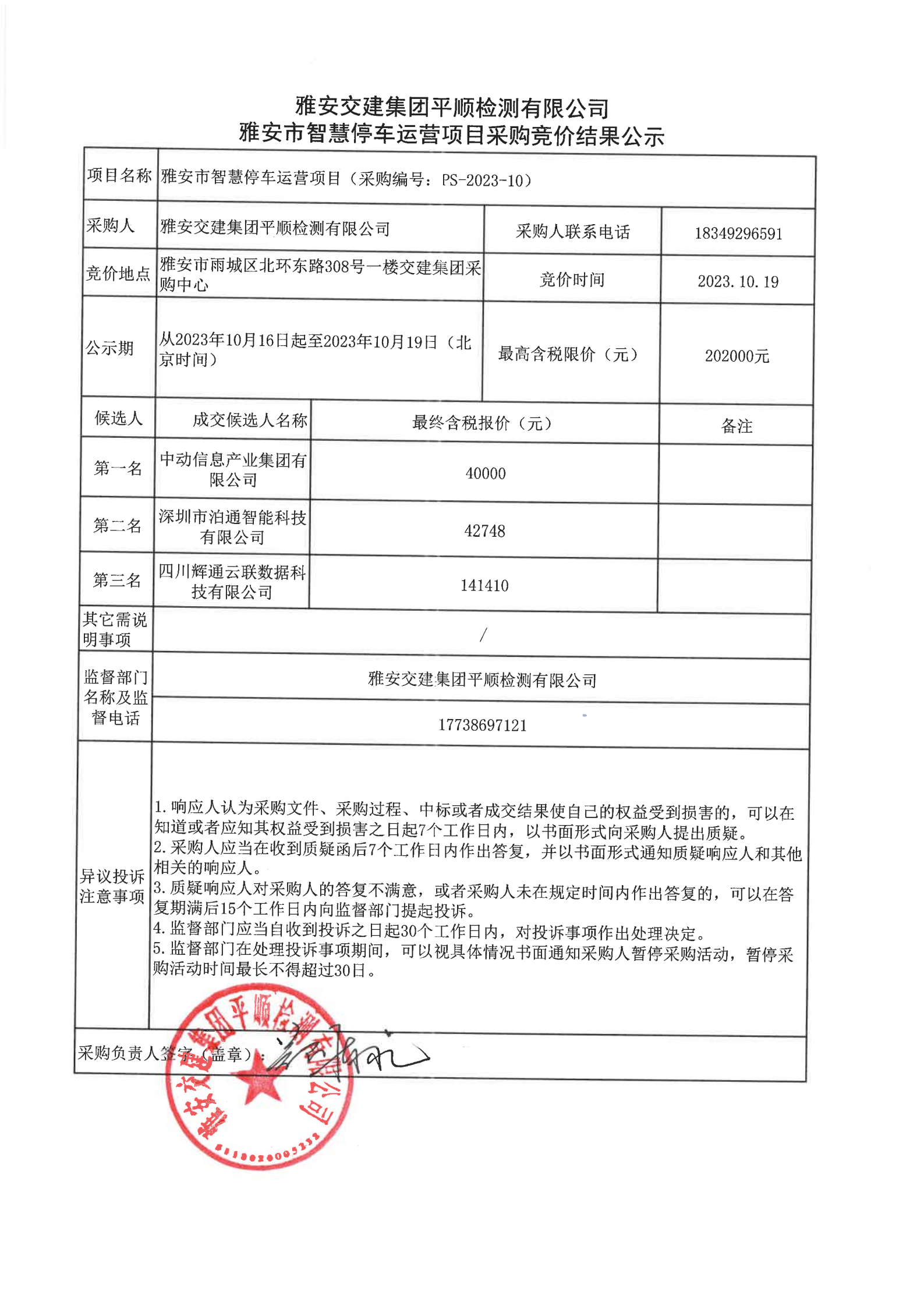 雅安交建集團(tuán)平順檢測(cè)有限公司雅安市智慧停車運(yùn)營項(xiàng)目采購競(jìng)價(jià)結(jié)果公示