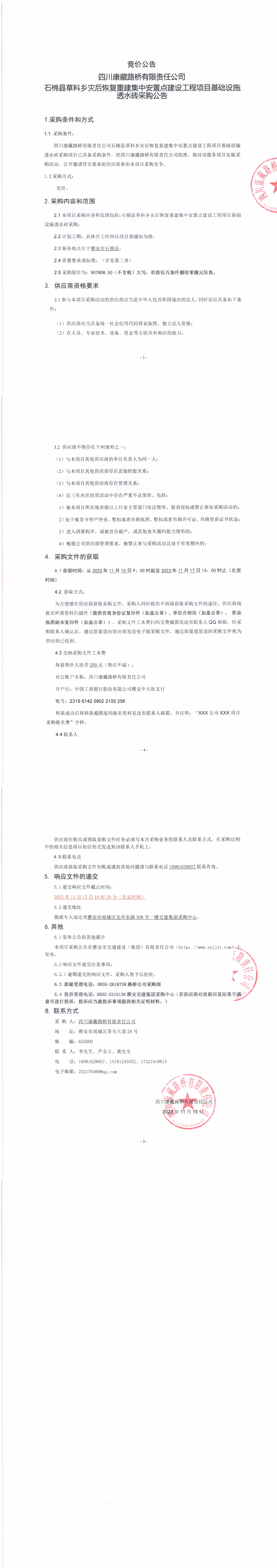 四川康藏路橋有限責任公司石棉縣草科鄉(xiāng)災后恢復重建集中安置點建設工程項目基礎設施透水磚采購公告