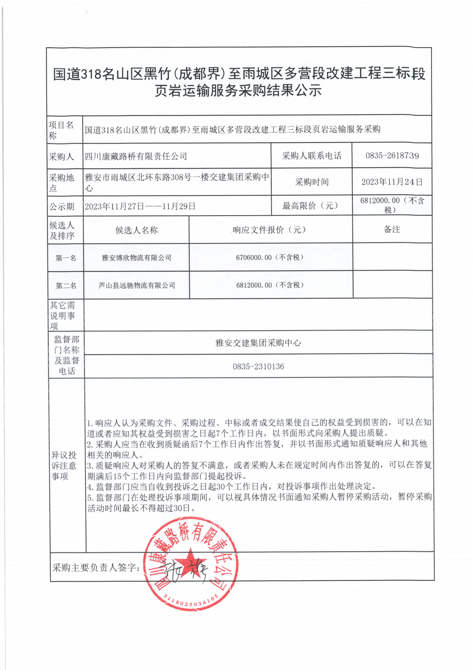 四川康藏路橋有限責(zé)任公司國道318名山區(qū)黑竹(成都界)至雨城區(qū)多營段改建工程三標(biāo)段頁巖運(yùn)輸服務(wù)采購結(jié)果公示