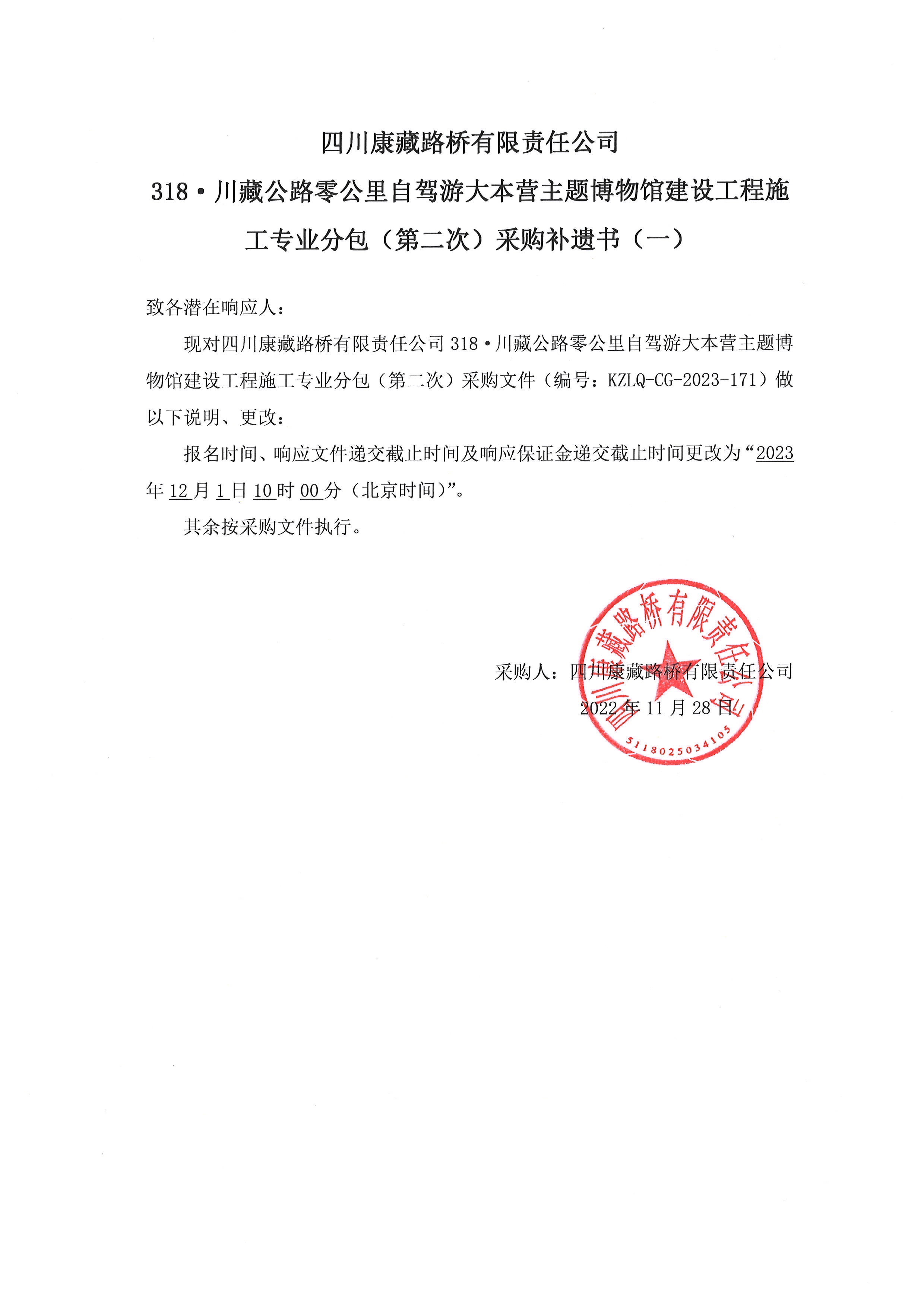 四川康藏路橋有限責(zé)任公司318·川藏公路零公里自駕游大本營(yíng)主題博物館建設(shè)工程施工專(zhuān)業(yè)分包(第二次)采購(gòu)補(bǔ)遺書(shū)(一)