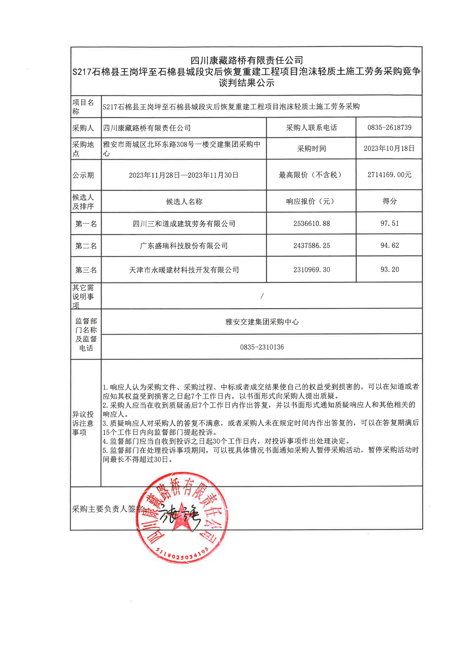 四川康藏路橋有限責任公司S217石棉縣王崗坪至石棉縣城段災后恢復重建工程項目泡沫輕質(zhì)土施工勞務采購結(jié)果公示
