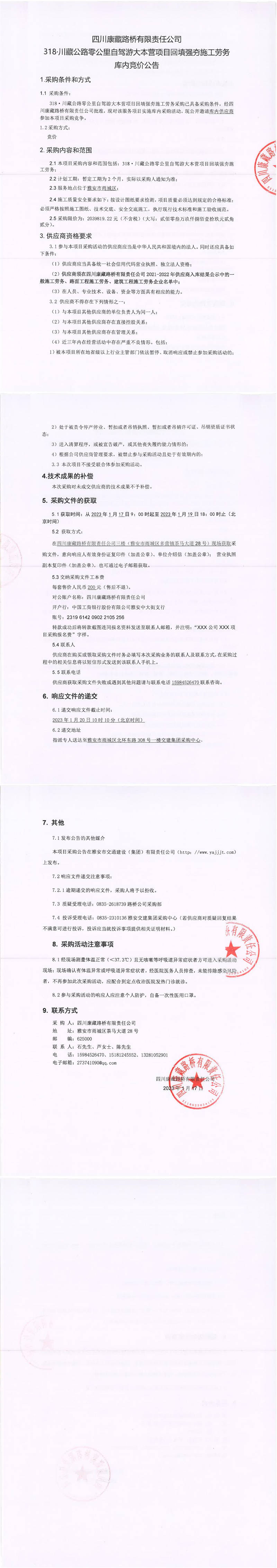 四川康藏路橋有限責任公司S431蘆山縣龍門至雙石段改建工程項目邊坡防護工程施工勞務(wù)采購競爭談判結(jié)果公示