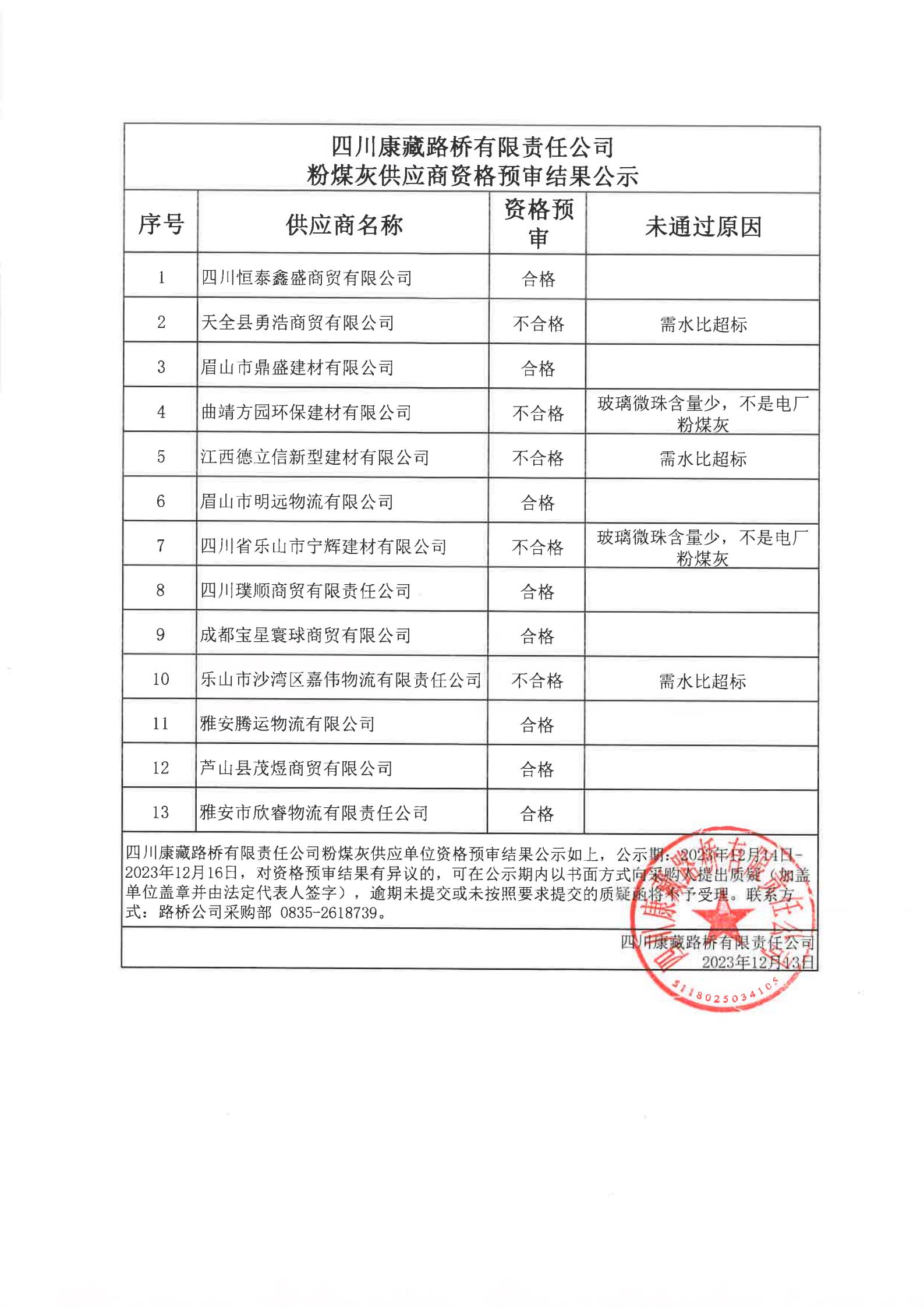四川康藏路橋有限責(zé)任公司粉煤灰供應(yīng)商資格預(yù)審結(jié)果公示