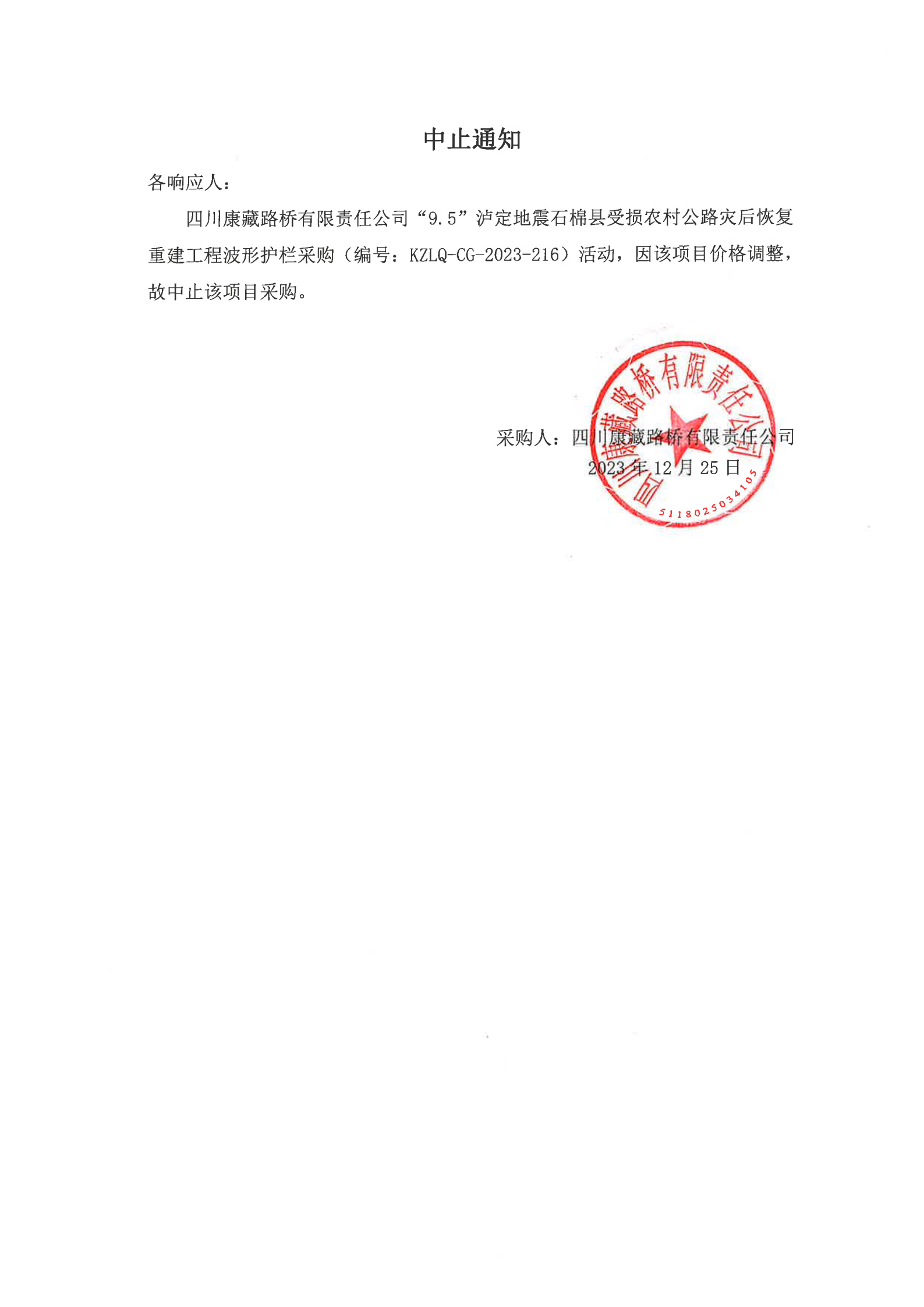 四川康藏路橋有限責(zé)任公司“9.5”瀘定地震石棉縣受損農(nóng)村公路災(zāi)后恢復(fù)重建工程波形護(hù)欄采購(gòu)中止通知