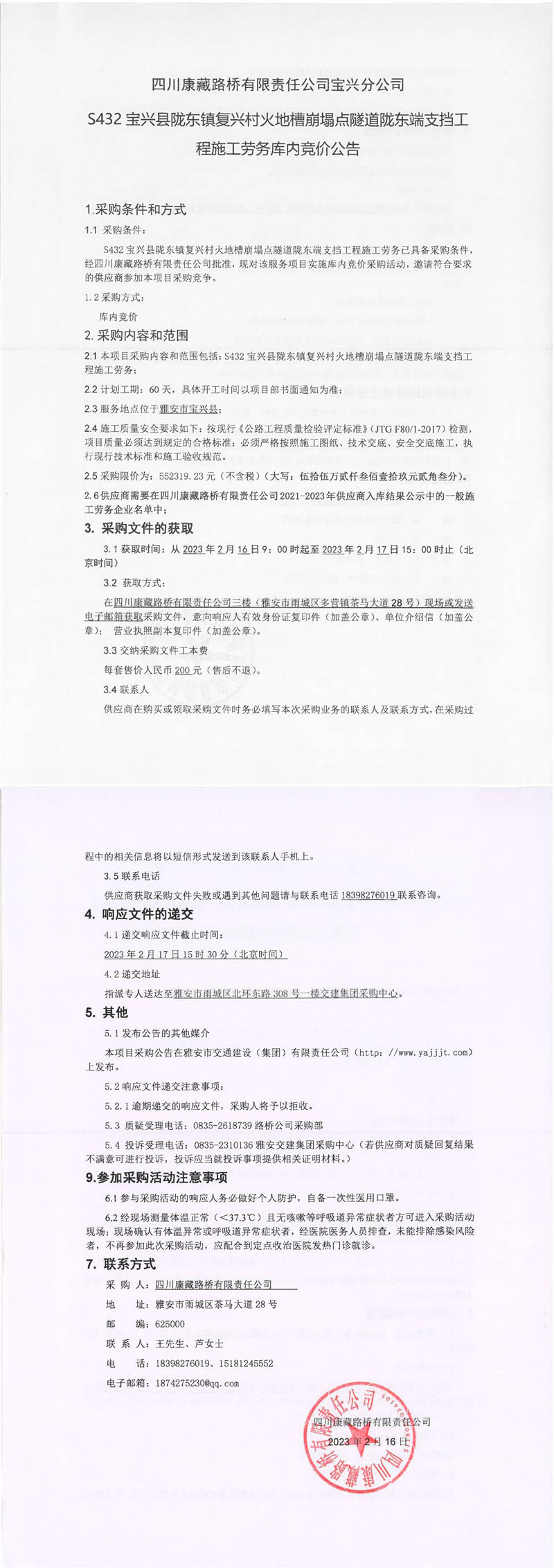 四川康藏路橋有限責(zé)任公司寶興分公司S432寶興縣隴東鎮(zhèn)復(fù)興村火地槽崩塌點(diǎn)隧道隴東端支擋工程施工勞務(wù)庫(kù)內(nèi)競(jìng)價(jià)公告