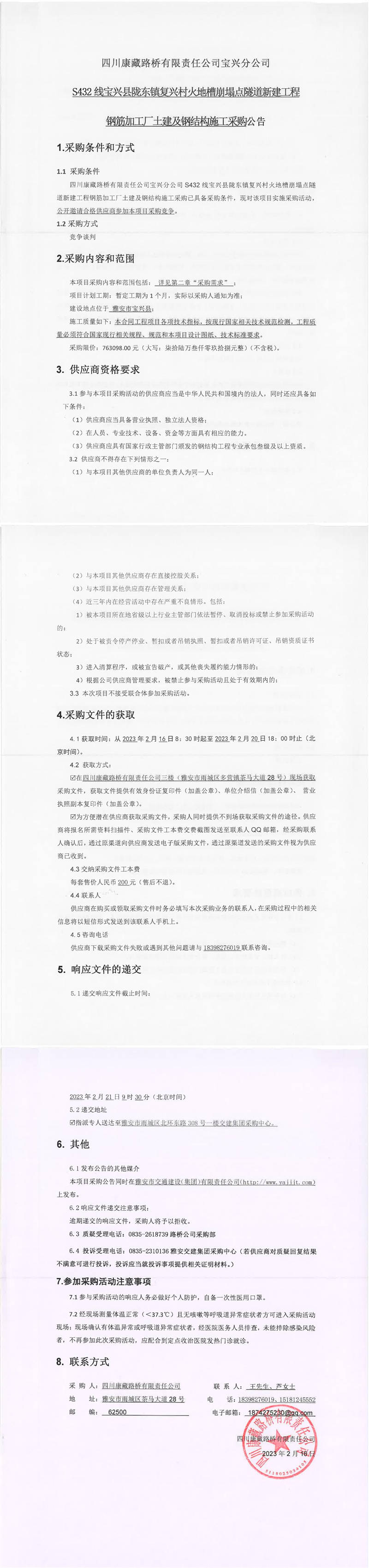 四川康藏路橋有限責任公司寶興分公司S432線寶興縣隴東鎮(zhèn)復興村火地槽崩塌點隧道新建工程鋼筋加工廠土建及鋼結(jié)構(gòu)施工采購公告
