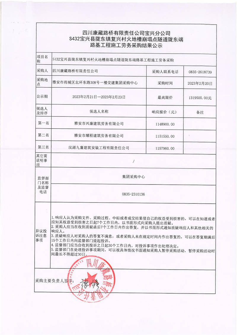 四川康藏路橋有限責任公司寶興分公司S432寶興縣隴東鎮(zhèn)復興村火地槽崩塌點隧道隴東端路基工程施工勞務采購結果公示