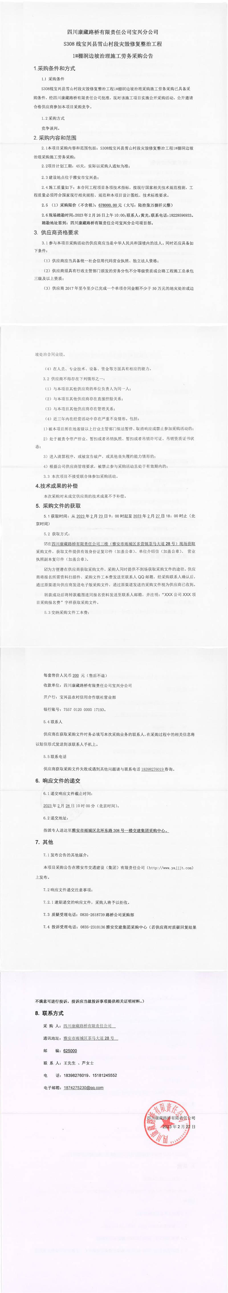 四川康藏路橋有限責任公司寶興分公司S308線寶興縣雪山村段災毀修復整治工程1#棚洞邊坡治理施工勞務(wù)采購公告