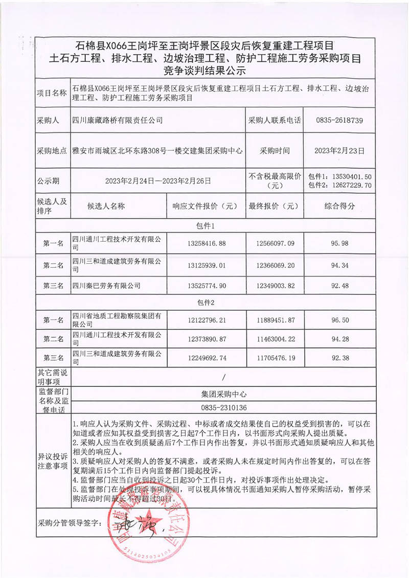 四川康藏路橋有限責(zé)任公司石棉縣X066王崗坪至王崗坪景區(qū)段災(zāi)后恢復(fù)重建工程項(xiàng)目土石方工程、排水工程、邊坡治理工程、防護(hù)工程施工勞務(wù)采購項(xiàng)目競爭談判結(jié)果公示